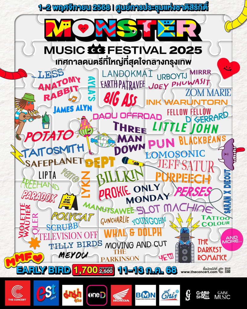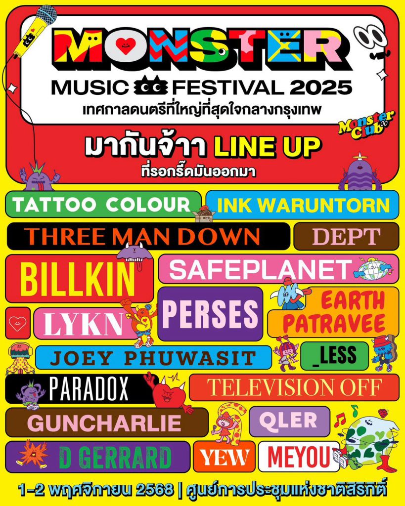 ความสนุกครั้งใหม่กำลังจะกลับมากับ เทศกาลดนตรีที่ใหญ่ที่สุดใจกลางกรุงเทพ “Monster Music Festival 2025” (มอนสเตอร์ มิวสิค เฟสติวัล 2025) พร้อมระเบิดความสนุก แบบนอนสต็อปตลอด 2 วันเต็ม 6 ฮอลล์ ในวันเสาร์ที่ 1 และอาทิตย์ที่ 2 พฤศจิกายน 2568 ณ ศูนย์การประชุมแห่งชาติสิริกิติ์ เตรียมตัวให้พร้อม เพราะงานนี้จัดใหญ่ไฟกระพริบ! โดยทีม GFest ผู้จัดเทศกาลดนตรี Rock Mountain และ Rock On the Beach หน่วยงานภายใต้ GMM SHOW ผู้จัดงานคอนเสิร์ตและเฟสติวัลที่ดีที่สุดของประเทศไทย ขนโปรดักชัน แสง สี เสียง ระดับพรีเมียม มาเอาใจแฟนๆ ในงานนี้